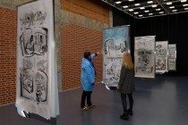Ici, dans une salle assombrie, cinq feuilles de zinc de deux mètres de haut flottent dans l’espace. Chacune sert de support sur ses deux faces à deux dessins superposés, le premier imprimé sur papier et le second réalisé sur calque. Par stratification, ce dernier semble se creuser, alors que par nos yeux, notre corps est aspiré dans un dédale d’images composites aussi anachroniques qu’étranges. C’est un sombre enchevêtrement de formes et de motifs dessinés au crayon graphite d’où émergent des intérieurs mystérieux évoquant les demeures du XIXe siècle, des chevelures et des papillons qui semblent vouloir fuir, des ciels tourmentés, des drapés rappelant les volutes de fumées volcaniques des gravures de Fabris, des vagues qui voudraient tout engloutir, des montagnes menaçantes, une silhouette humaine dont on ne devine qu’un incertain profil mais qui déjà se fait rocher, comme pétrifiée dans un univers explosé : la vision d’un violent et lugubre tremblement du monde dont l’œuvre raconte toute entière l’histoire, jusqu’au dernier dessin où se profile un soupçon de printemps.