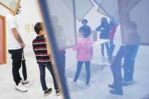 Dans la première salle de l’exposition, les enfants suivent les trajectoires des lignes tracées au sol. Ils découvrent également des images de Fred Astaire, qui continue à danser sur les murs dans le film « Royal Wedding » !