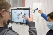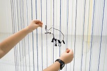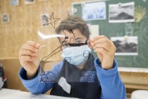 Après la visite, les enfants passent en salle pédagogique pour l’atelier : à l’aide d’un rodoïd transparent et d’un feutre, ils dessinent des formes, des personnages. Ils superposent ensuite leur transparent à des éléments de l’architecture du Frac ou sur des œuvres, photographiant le résultat obtenu. Ils créent ainsi une mise en scène, mettent leur personnage en situation et jouent avec les fenêtres, les pleins et les vides, etc. Ils ajoutent ensuite des formes colorées à leur personnage, et figent leur composition en la plastifiant.