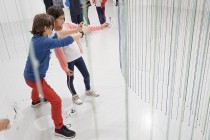 Le groupe s’intéresse ensuite à la salle des « Lisses », Matthieu leur explique la technique de fabrication de l’œuvre, et les incite à réfléchir aux ressemblances et aux différences entre cette pièce et le reste du travail de Cécile Bart : est-ce la même technique ? les mêmes matériaux ? retrouve-t-on l’idée de couleur ? de superposition ? la question du déplacement et du point de vue du spectateur ? Matthieu leur fait également découvrir les jeux d’illusion d’optique et la notion de « moiré » grâce aux fils de laine qui constituent l’œuvre.