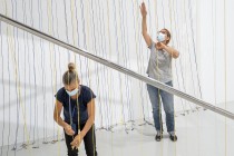Enfin, une fois les oeuvres accrochées, la lumière est ajustée par un créateur lumière, afin de jouer au mieux sur la transparence et les effets de lumière naturelle - éléments chers à Cécile Bart. La signalétique est collée sur les murs en dernier (cartels, édito à l'entrée de l'exposition).