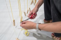 Pour l'exposition de Cécile Bart, plusieurs oeuvres sont installées et créées in situ, comme ces installations nommées "Lisses", des cerceaux de bois auxquels sont supendus des fils de laine colorée, déroulés patiemment un à un par l'équipe technique !